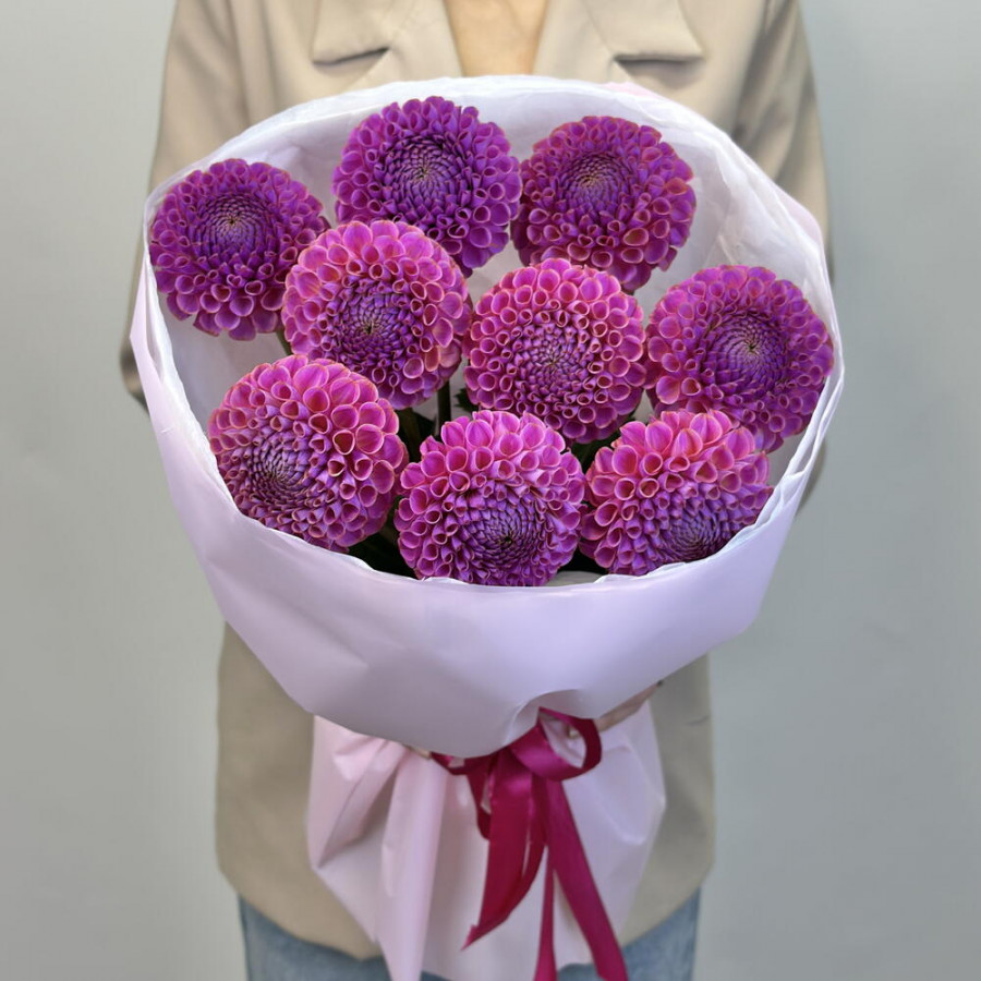 На фото букет из 9 фиолетовых георгин. В составе: георгина 9 шт, дизайнерская упаковка 1 шт, атласная лента 1 шт, . Все цветы свежие и ароматные, букет красиво оформлен и отлично подходит для подарка. Доступна доставка цветов или самовывоз.