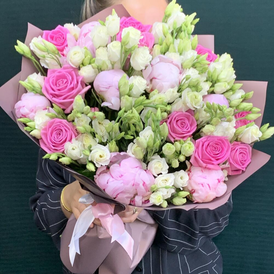 На фото букет «дыхание любви». В составе: роза 10 шт, эустома (лизиантус) 13 шт, пион 7 шт, дизайнерская упаковка 2 шт, атласная лента 1 шт, . Все цветы свежие и ароматные, букет красиво оформлен и отлично подходит для подарка. Доступна доставка цветов или самовывоз.