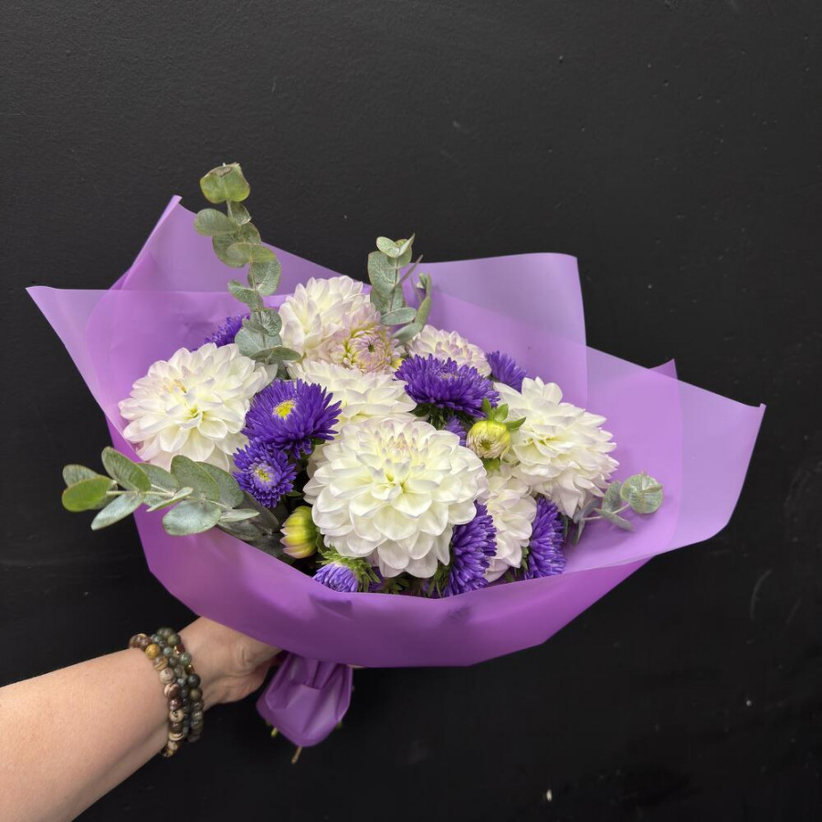 На фото букет из георгинов и астр. В составе: георгина 7 шт, астра 6 шт, эвкалипт 4 шт, дизайнерская упаковка 1 шт, атласная лента 1 шт, . Все цветы свежие и ароматные, букет красиво оформлен и отлично подходит для подарка. Доступна доставка цветов или самовывоз.